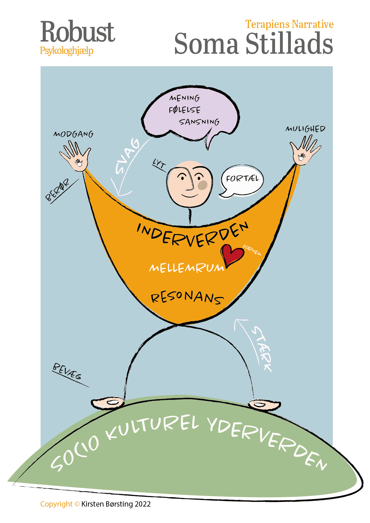 Konkret brug af kroppen i kropsterapi er SOMA Embodiment og en væsentlig tilføjelse til Narrativ terapi, hvor vi arbejder med sprog. Der er brug for både kontekst, sprog og krop i psykoterapi. I neurovidenskabelig forskning benævnes det som psykoterapi med inddragelse af topdown og bottom up processer. Og derfor har jeg videreudviklet Narrativ terapi til Narrativ SOMA terapi.